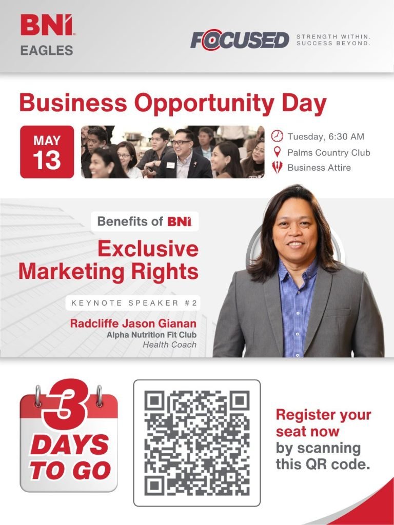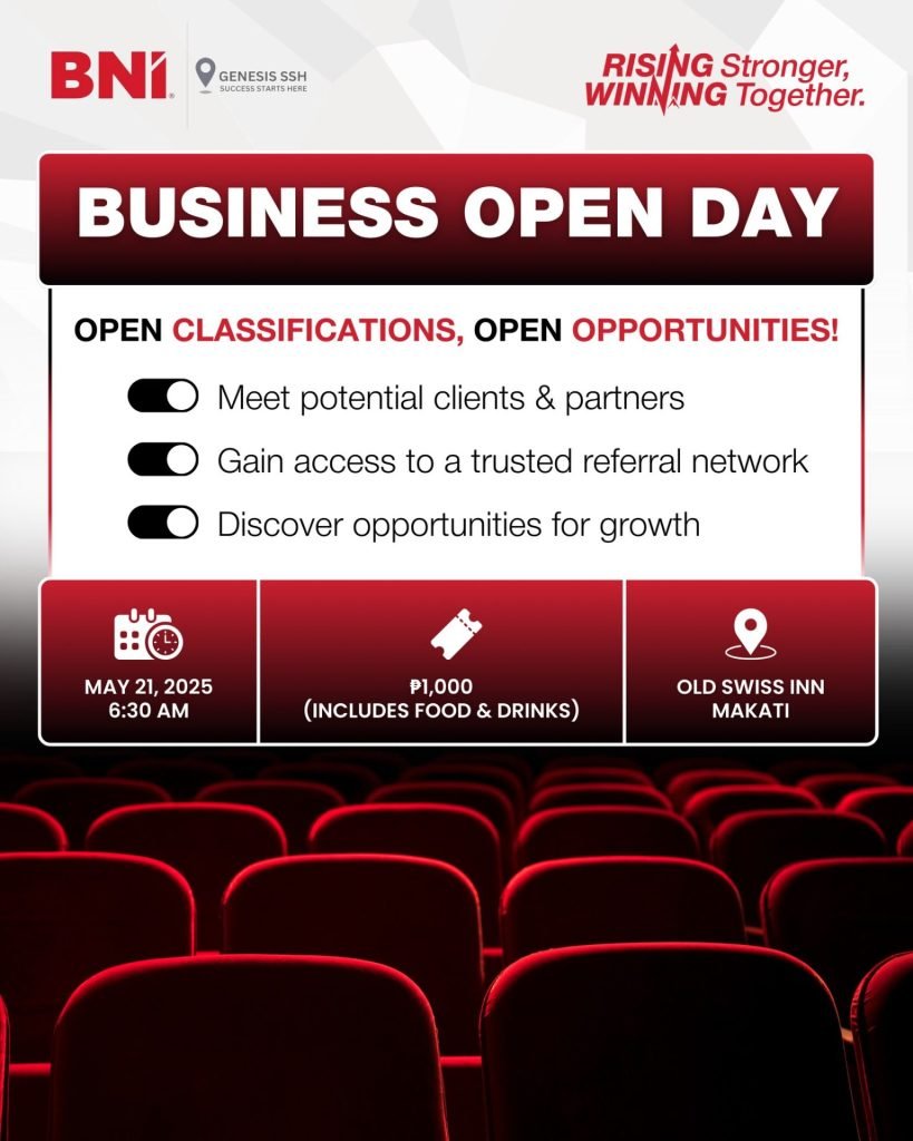 Visit BNI.Ph to find a BOD near you or reach out to a local BNI Director or Chapter Presidents to reserve a seat.